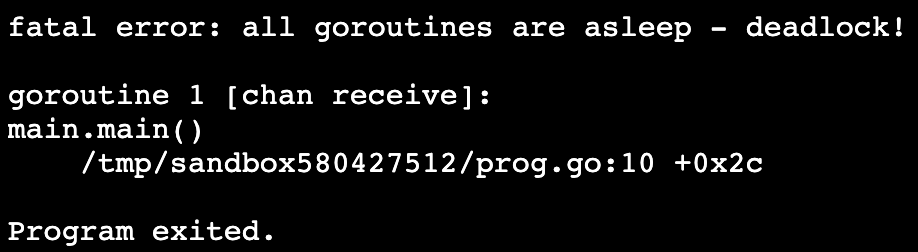 В отличие от других языков, в Go нет исключений — принято возвращать ошибки явно. Но компилятор может анализировать программу во время выполнения и сигнализировать о фатальных ошибках. Например, если программа зависает в ситуации deadlock’a.