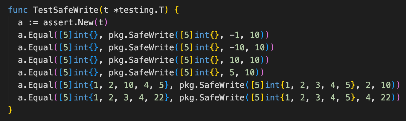 Тестирование кода на Go происходит с помощью фреймворка Testify, сами тесты также написаны на языке Go. Проверка кода запускается автоматически после нажатия на кнопку «Проверить». Тестируемая программа компилируется и проверяется с разными входными данными. При этом тесты следят, чтобы поведение программы соответствовало ожиданиям.
