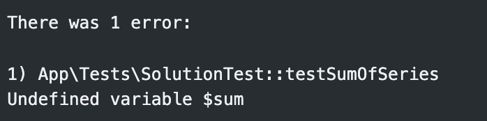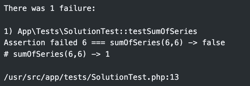 Здесь мы видим, что выполнение остановилось на тесте под названием testSumOfSeries. Далее говорится, что сравнение ожидаемого результата, а это цифра 6, и результата работы функции вернуло false