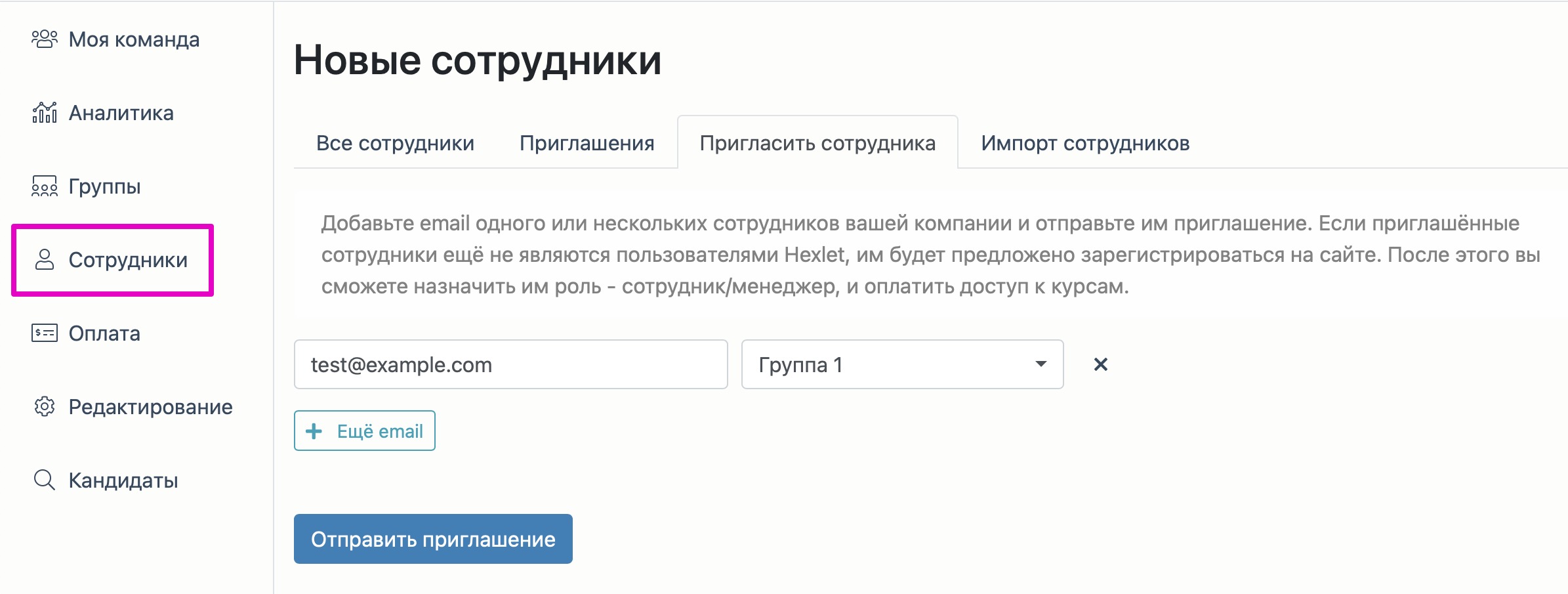 Чтобы сотрудник получил доступ к курсам, пригласите его присоединиться к компании. Для этого заполните форму в разделе «Сотрудники» → «Пригласить сотрудника»