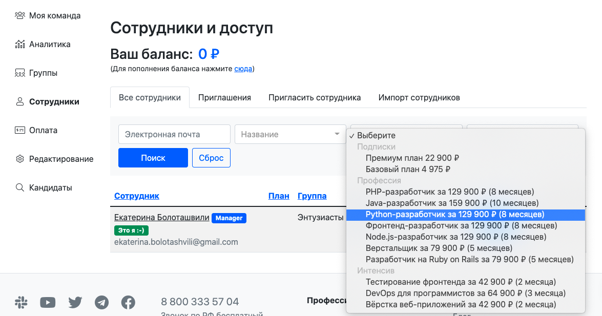 Для этого в разделе «Сотрудники», напротив нужного сотрудника выберите курс или, профессию, которую хотите приобрести для сотрудника и нажмите кнопку «Купить». С баланса спишется сумма за первый месяц доступа, если это подписка, или сразу за профессию целиком. После чего со студентом свяжется наш куратор и проконсультирует о дальнейших действиях. Если ошиблись, в течение 15 минут операцию можно отменить, и деньги вернутся на баланс.