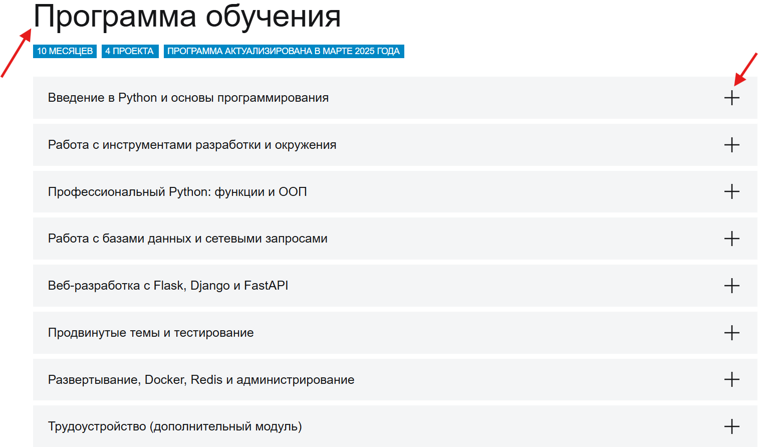 А просто ознакомиться с содержанием профессий можно в разделе «Программа обучения»/«Учим необходимому» на странице любой профессии: там будет отображен полный список входящих курсов.