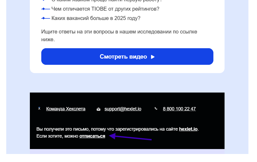 Кроме того, вы всегда можете обратиться в нашу поддержку по адресу support@hexlet.io, и команда оперативно поможет вам отключить рассылку.