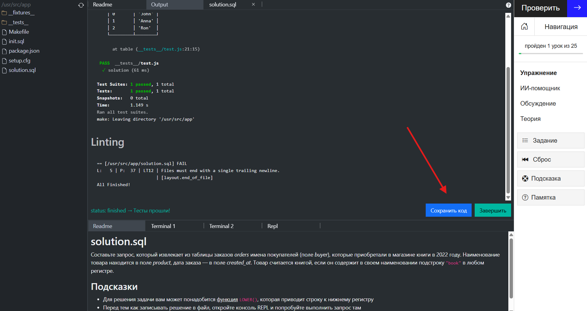 Если после прохождения урока долго не заходить в тренажёр, ваше решение может перестать отображаться в нём. При этом отметка о прохождении урока сохранится, если задание было выполнено успешно.