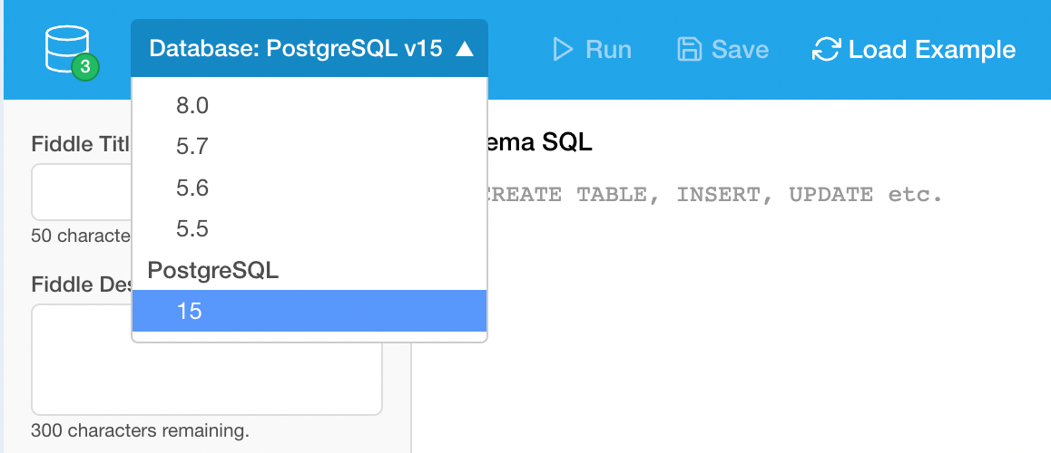 Первое, что нужно сделать при входе на DB Fiddle — выбрать подходящую базу данных и ее версию. Например, мы выберем PostgreSQL 15: