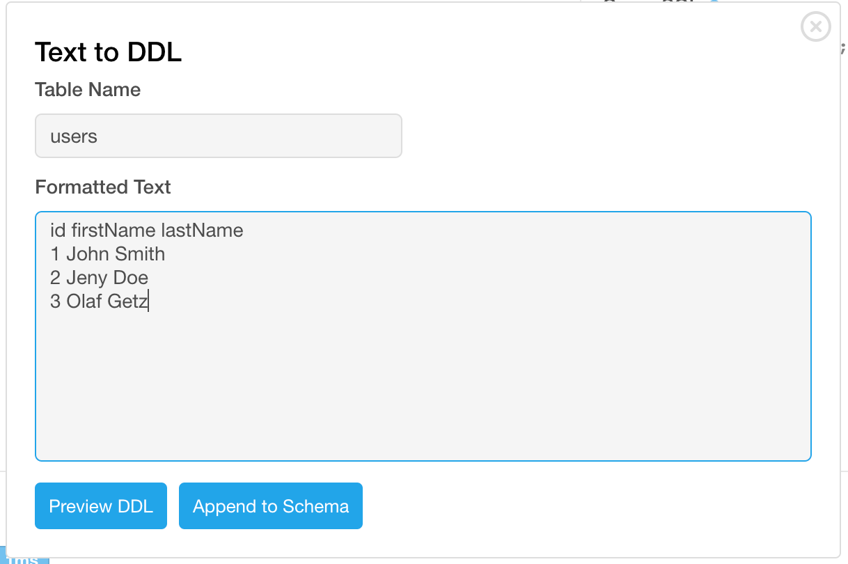 Второй вариант. Если готового скрипта нет, вы можете воспользоваться специальной возможностью — Text to DDL и DB Fiddle поможет преобразовать текст в SQL-скрипт. Нажмите кнопку Text to DDL, далее вы сможете дать вашей таблице имя и наполнить ее данными: