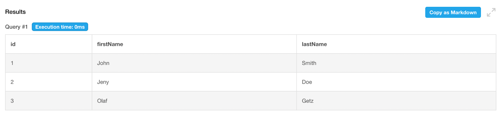 Чтобы выполнить этот запрос, нажмите кнопку Run. Результат выполнения запроса появится в нижней части окна. Например, если мы выполним запрос выше, то получим такую таблицу: