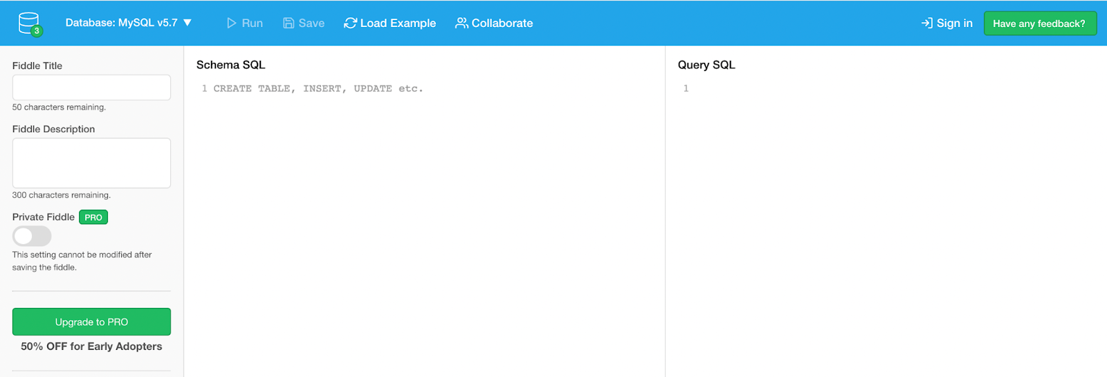 Мы воспользуемся сервисами, которые позволяют попрактиковаться в выполнении запросов прямо в браузере. Один из таких — DB Fiddle. Это довольно популярный сервис, который поддерживает различные базы данных и не требует регистрации. Так он выглядит: