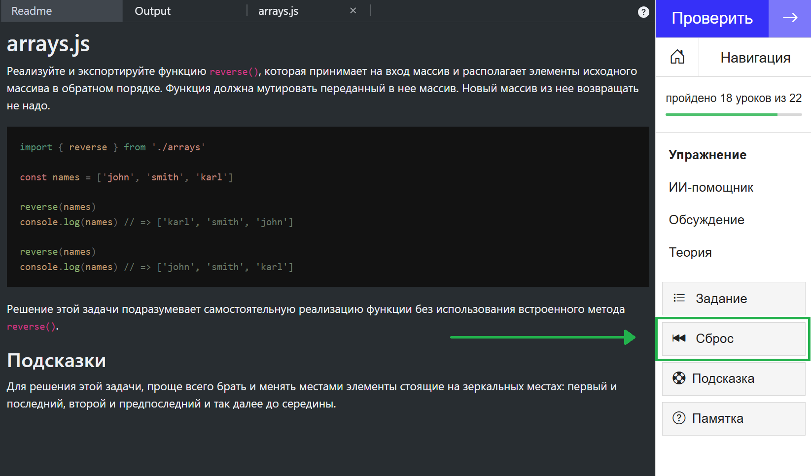 Вы всегда можете вернуть упражнение в изначальное состояние. Для этого нажмите «Сброс» в меню справа.
