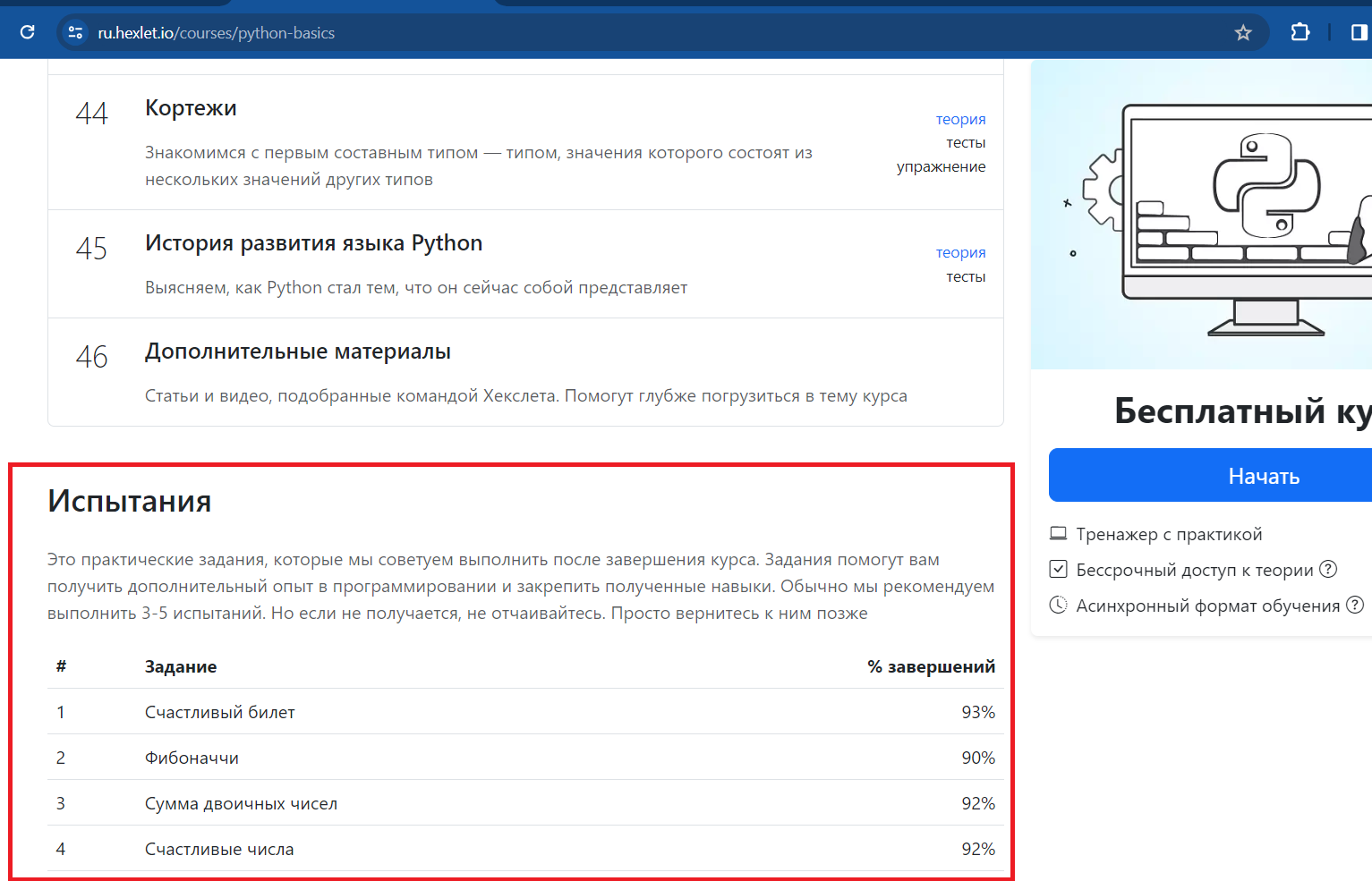 Испытания не являются обязательной частью курсов, а проходить их можно по желанию в любом количестве. Однако за успешное прохождение таких заданий можно получать дополнительные баллы, которые отражаются в вашем прогрессе курса и влияют на общий рейтинг. Мы рекомендуем выполнять 3-5 испытаний для закрепления навыков. Если не получается пройти испытание сразу после прохождения курса, то вернуться к нему можно позже.