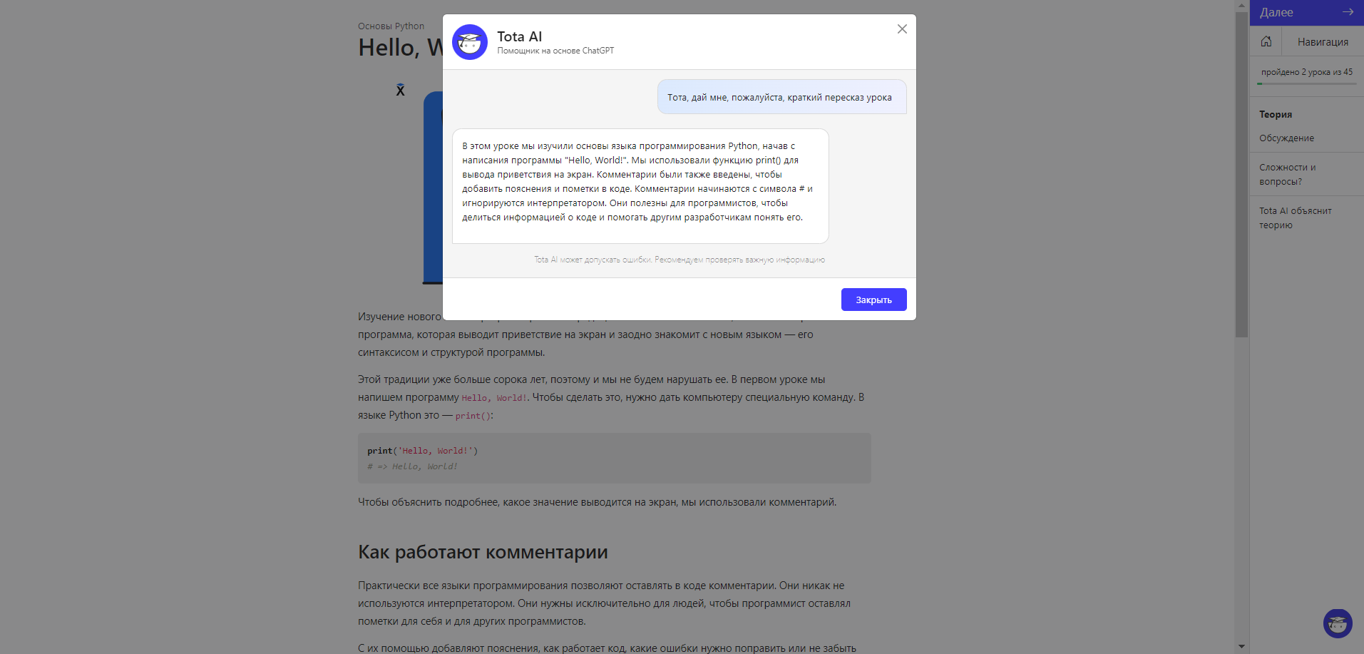 При нажатии на кнопку “Объясни код” появится окно, где Тота подробно распишет все детали.