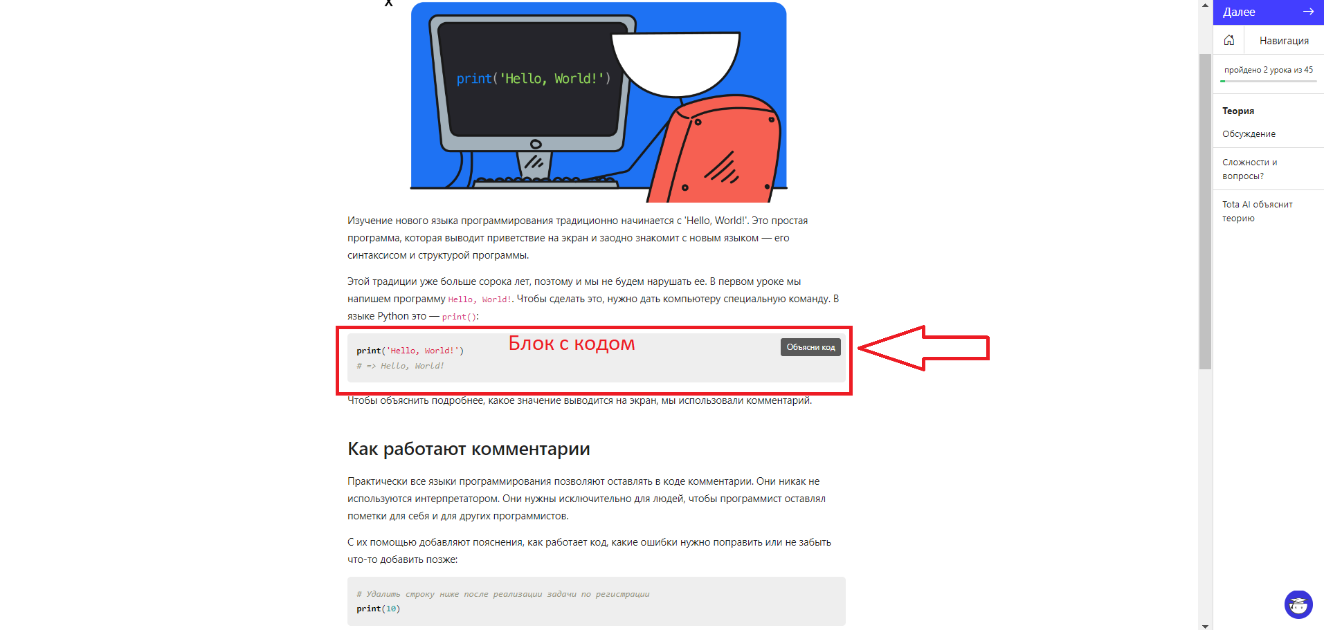 Ещё Тота может объяснить подробно код из примеров в теории уроков. Для этого нужно навести курсор на блок с кодом и появится кнопка “Объясни код”