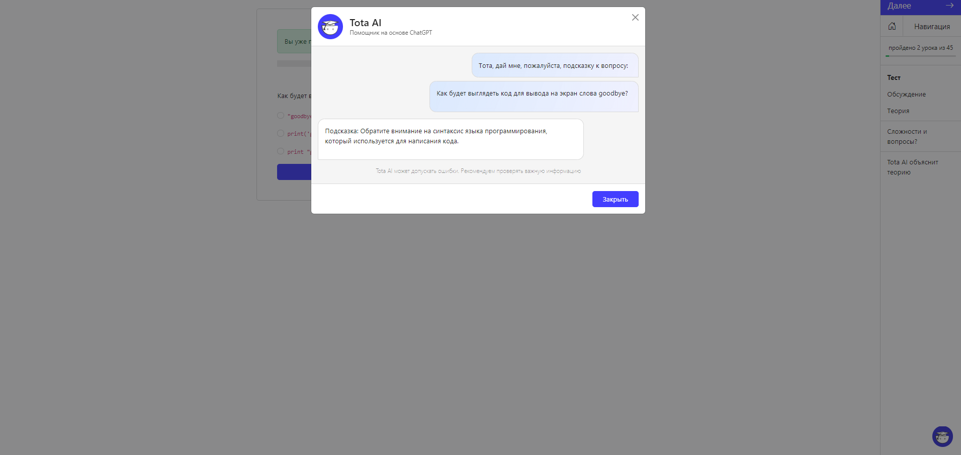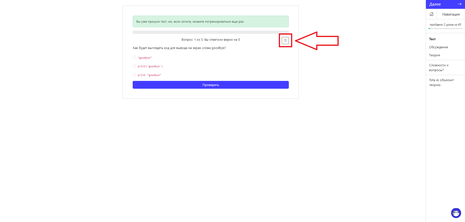В большинстве наших курсов следующим шагом после теории является прохождение небольшого опроса на закрепление знаний, он же называется квизом. Если сходу не получается пройти квиз, то можно получить подсказку у Тоты, нажав на кнопку в виде вопросительного знака.