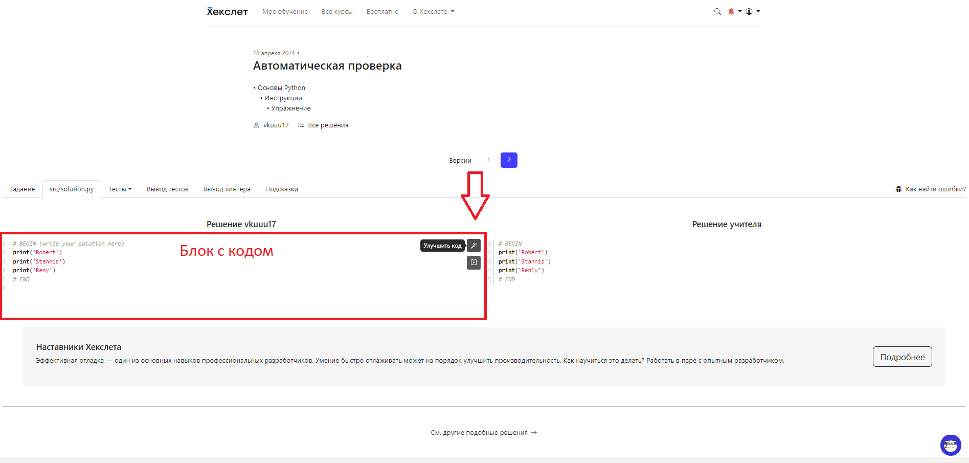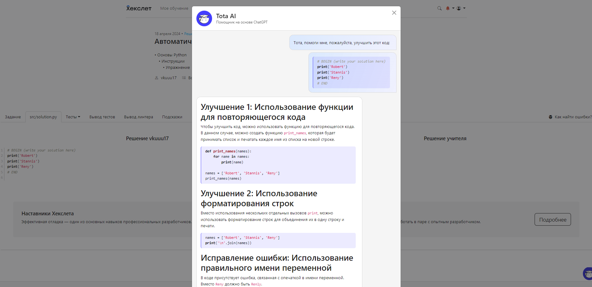 Если навести курсор на блок с кодом вашего решения и нажать на кнопку “Улучшить код”, откроется окно с рекомендациями от виртуального помощника.