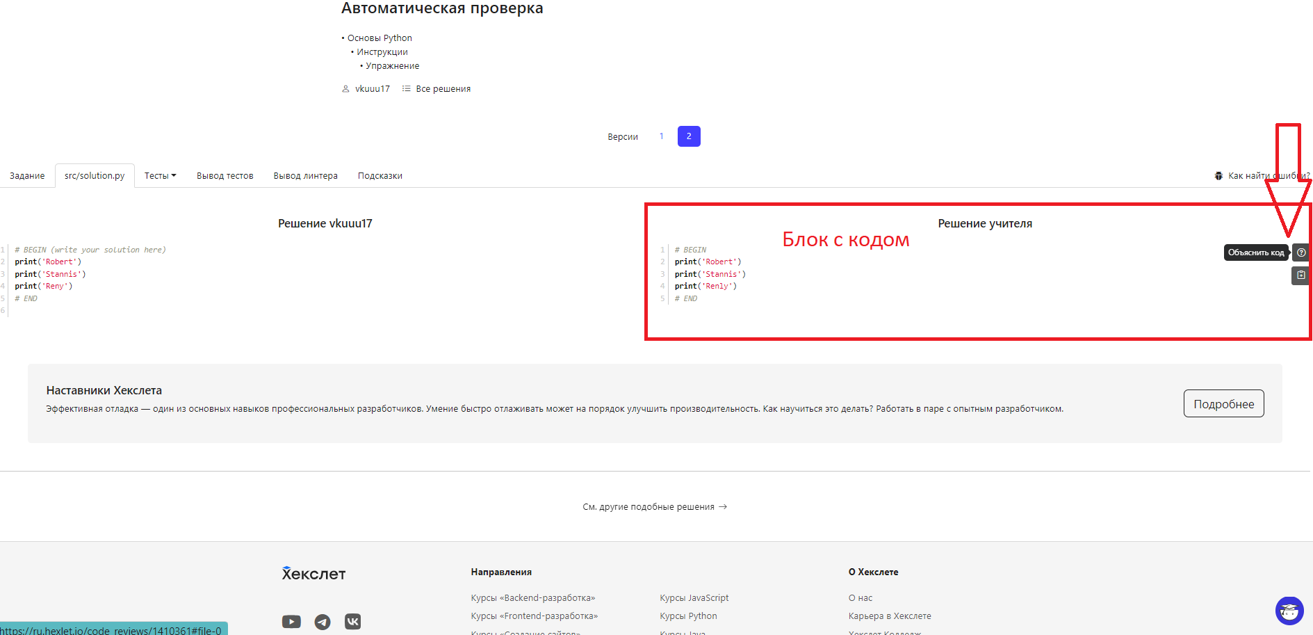 Если навести курсор на блок с кодом в решении учителя и нажать на кнопку “Объяснить код”, откроется окно с подробным разъяснением.