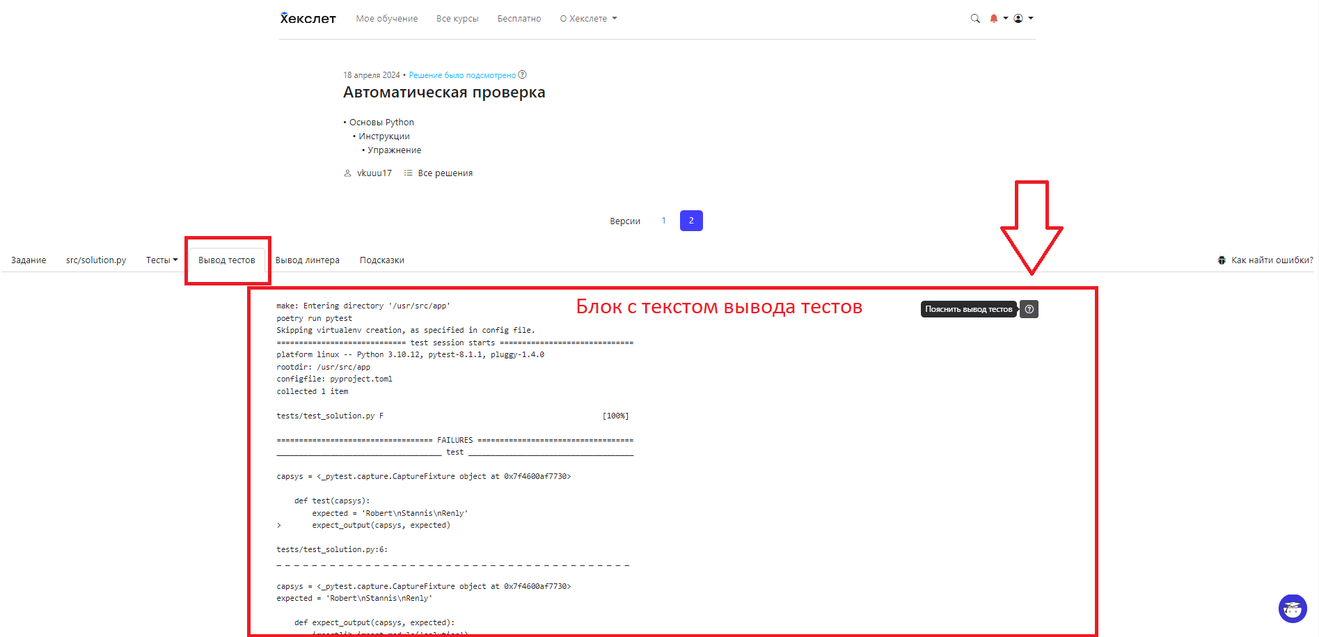 - Получить расшифровку вывода тестов вашего решения, если есть ошибки
