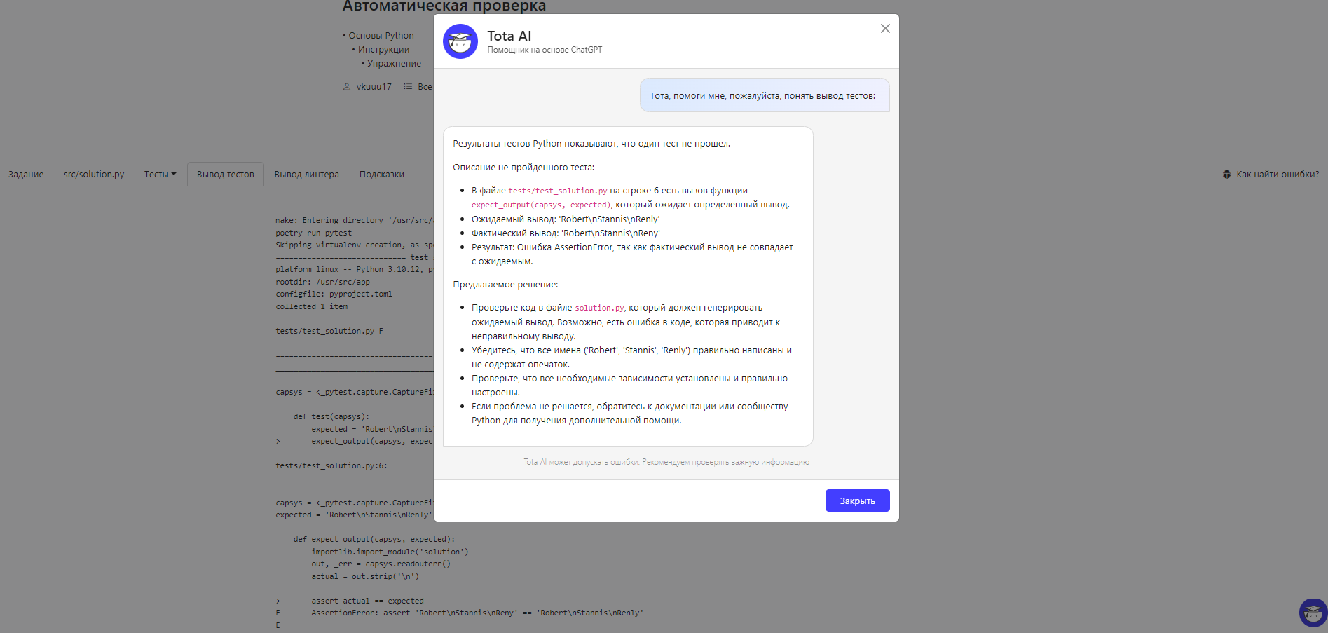 Если в вашем сохраненном решении есть ошибки, то при переходе во вкладку “вывод тестов” и наведении курсора на блок с текстом вывода появится кнопка “Пояснить вывод тестов”. При нажатии на эту кнопку откроется окно с объяснением Тоты.