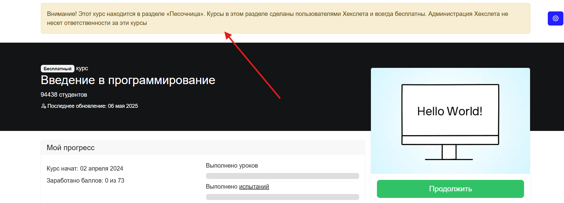 Ранее в Хекслете существовал раздел «Песочница», куда наша команда помещала курсы, созданные пользователями Хекслета. Эти курсы не поддерживаются технической командой и информация в них не обновляется, поэтому сейчас их можно рассматривать как архивные материалы.