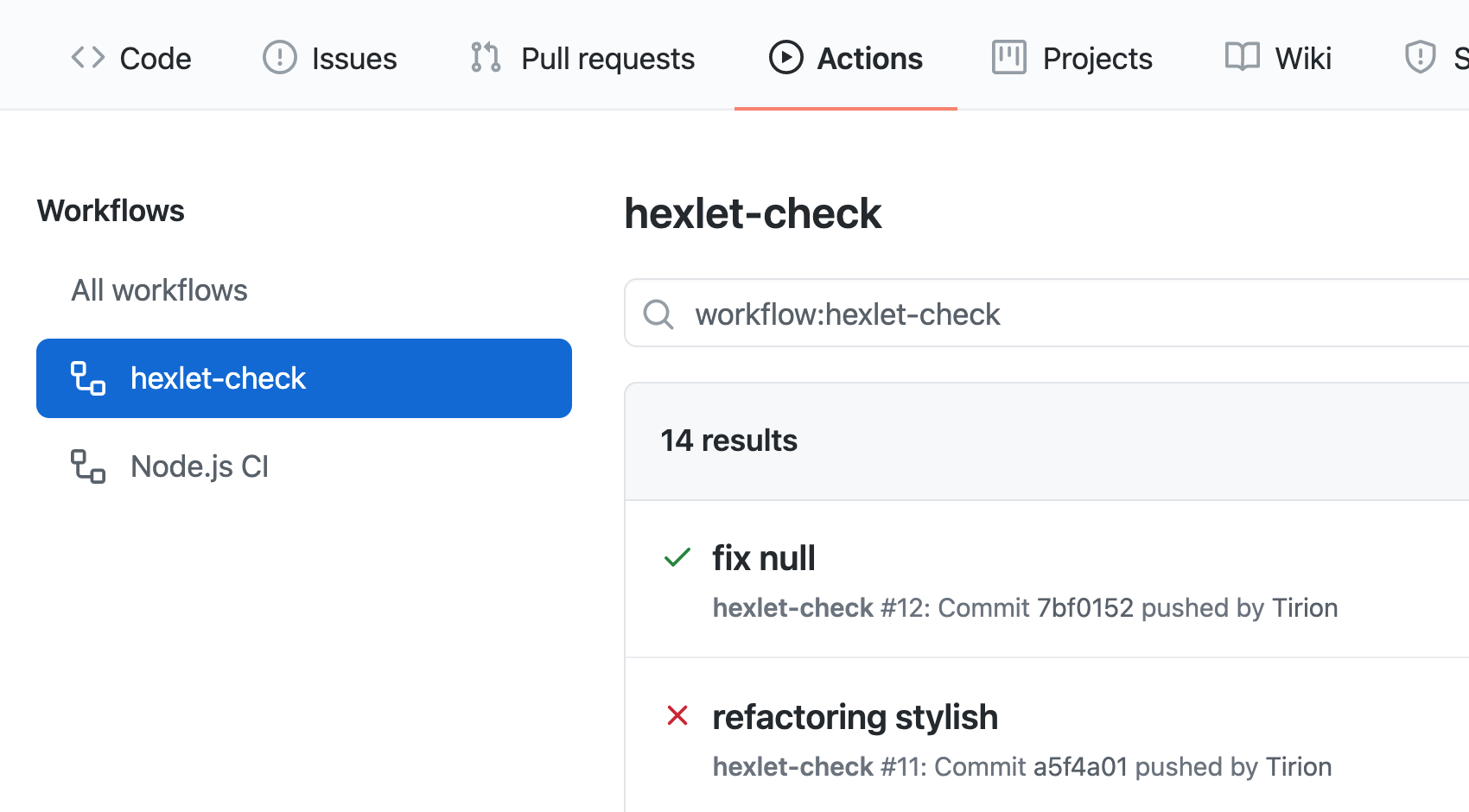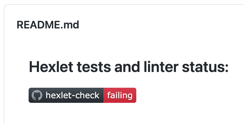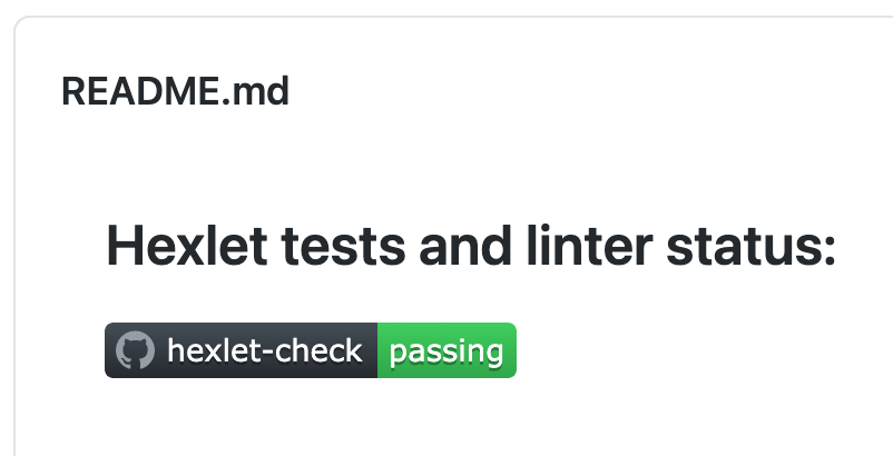 Результат проверки отображается в бейджике в README репозитория и на странице Actions → Workflows → hexlet-check. Если все проверки успешно пройдены, бейджик будет зелёным, а в результатах запуска экшена появится зелёная галочка. Если тесты или линтер нашли ошибки, вы увидите красный бейджик и красный крестик.