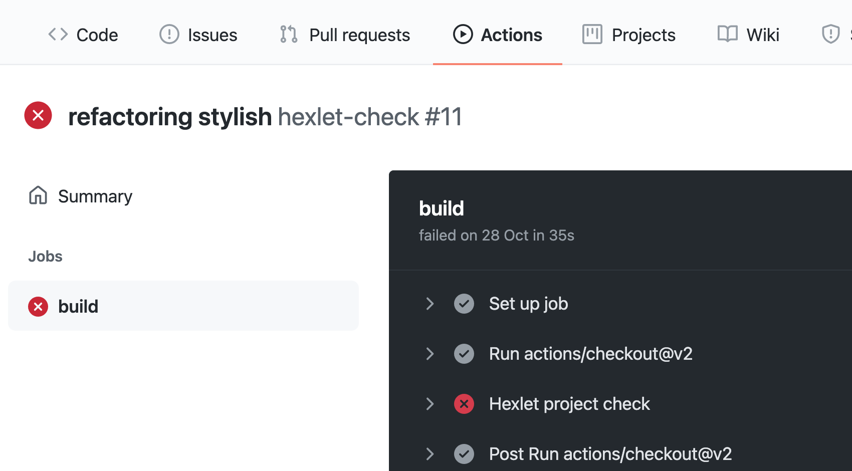 Здесь для примера будет выбран экшен, упавший на коммите refactoring stylish