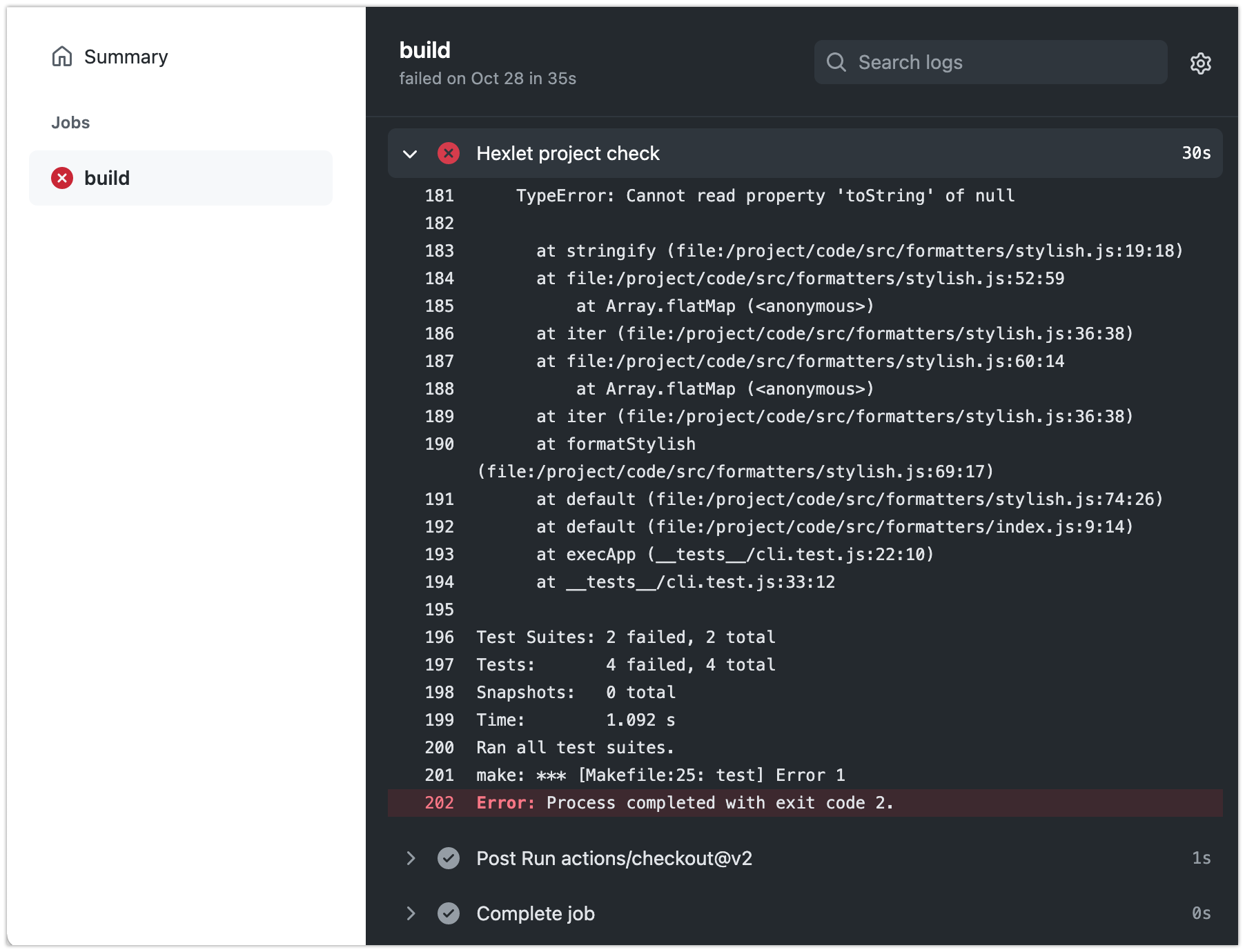 Слева, в блоке Jobs, вы увидите джобу build. Выберите её — справа загрузится список шагов. Нас интересует шаг Hexlet project check