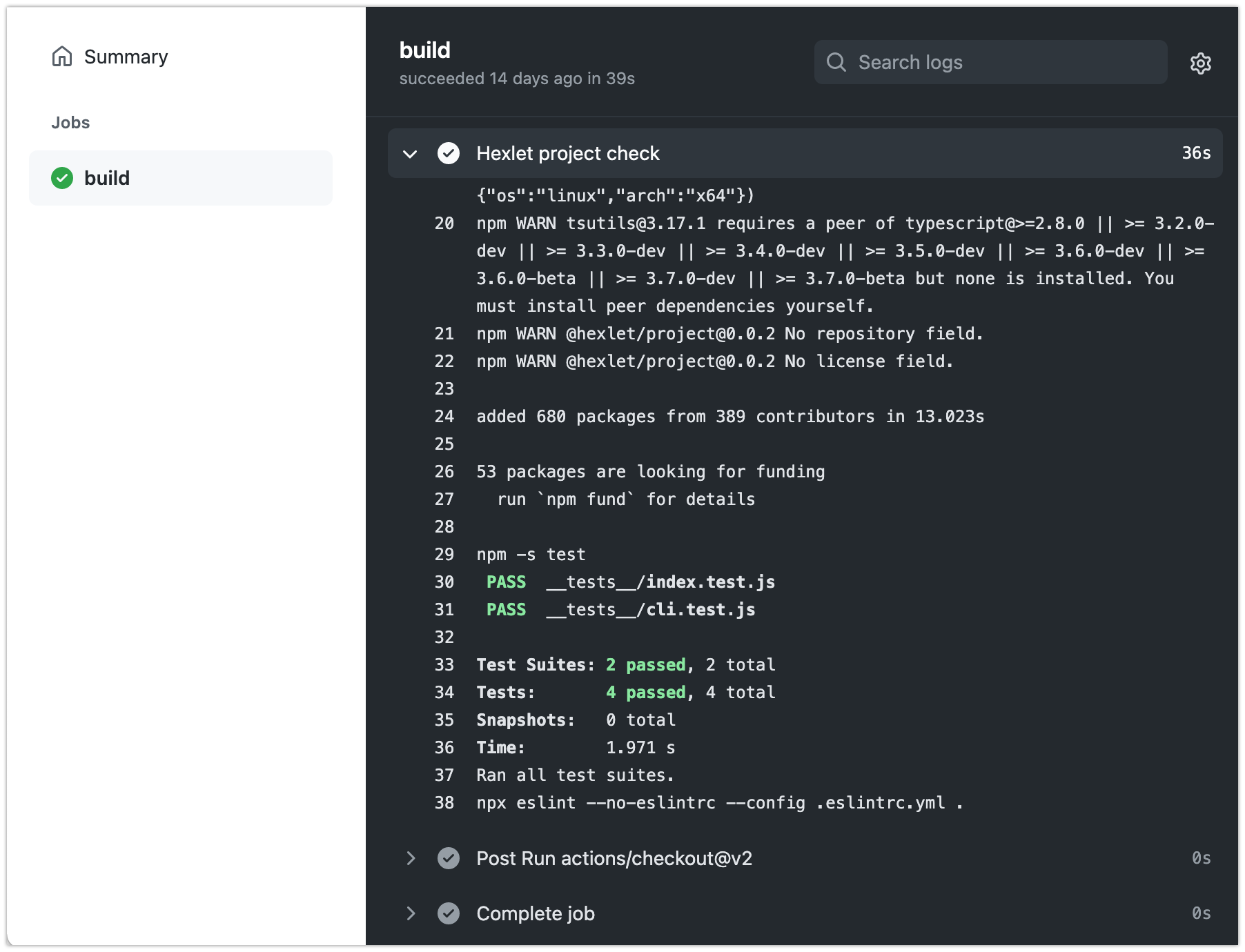 Если его развернуть, откроется лог, показывающий всё, что происходило. Первые несколько десятков строк — это служебная информация, их можно пропустить. Ищите сообщения, похожие на результаты проверки конкретно вашего проекта. Например, вот так будут выглядеть сообщения об упавших и пройденных тестах.