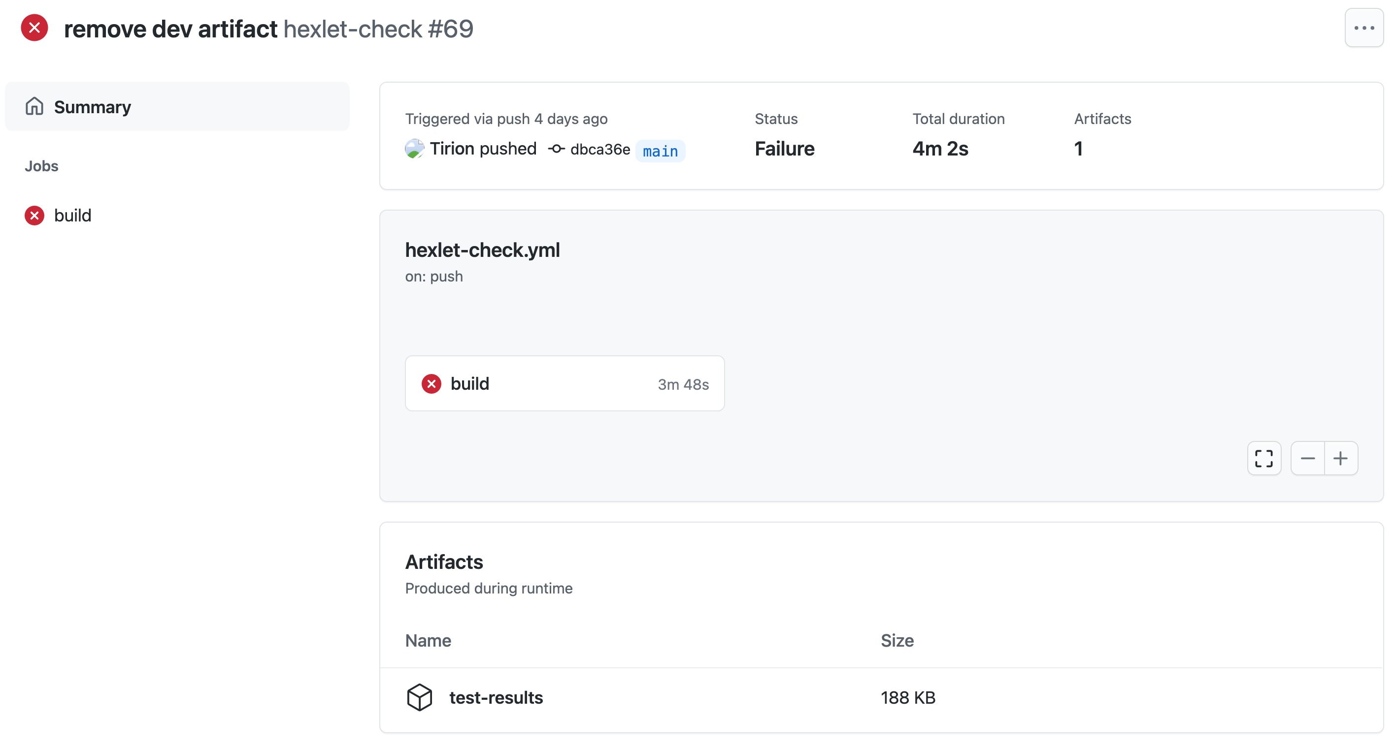 В проектах к результатам тестов могут быть прикреплены разнообразные файлы. В проектах с фронтендом это скриншоты страниц, если их внешний вид отличается от ожидаемого. В других типах проектов артефактами могут выступать файлы тестов, конфигурационные файлы линтера, статического анализатора и другие файлы, необходимые для диагностики и устранения проблем. В GitHub такие файлы называются артефактами (Artifacts), они доступны для скачивания внизу страницы с упавшим экшеном.