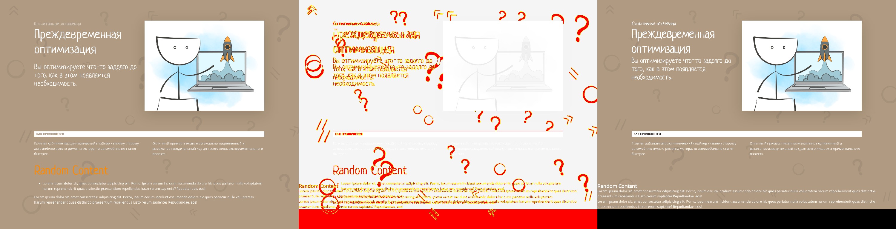 В студенческом проекте (справа) фрагмент страницы оказался ниже, чем нужно (слева), а также есть различия в расположении и оформлении текста. Всё, что отличается, выделено красным на скриншоте посередине.