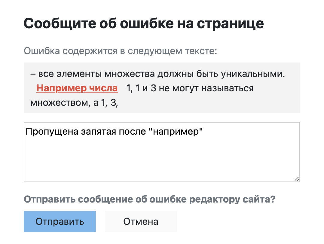 - В появившемся окне опишите ошибку или предложите свой вариант. Нажмите «Отправить»